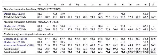表 1:跨语言分类准确率结果。测试了 15 种 XNLI 语言的准确性。我们报告了基于跨语言句子编码器的机器翻译 baselines 和 zero-shot 分类方法的结果。XLM (MLM) 对应于只在单语语料库上训练的无监督方法,XLM (MLM+TLM) 对应于通过 TLM 目标利用单语和并行数据的监督方法。∆对应的平均精度。