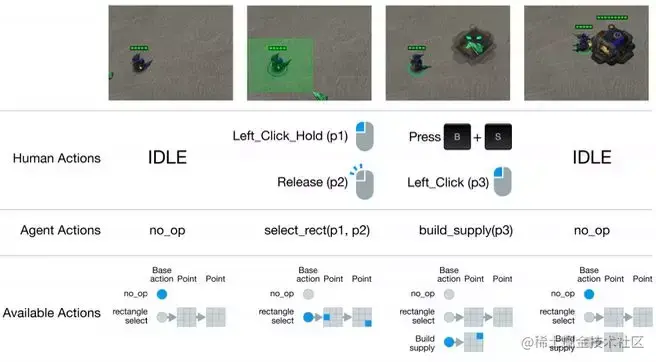 AI一旦从决策空间选定了宏操作之后,就会生成一条 (a0, a1, a2, a3, a4, ...) 形式的指令,其中“a0”指定了300多个基本操作之一,而“a1, a2…”是操作参数,比如给需要移动单位指定目的地。直观图示如下: