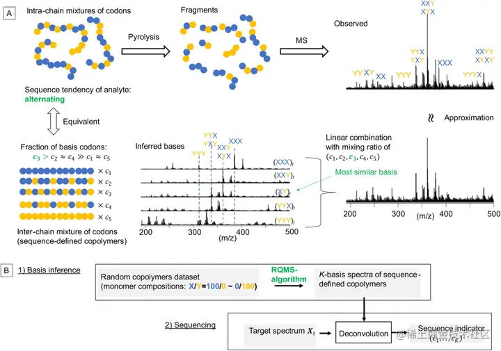 具体而言,首先从理论上构建一个 RQMS 算法。然后,通过三元均聚物薄膜的基准成分分析来验证 RQMS 的准确性。通过基准测试,证明 RQMS 可以在不使用纯成分光谱或任何成分先验知识的情况下进行准确的成分分析。然后将 RQMS 用于排序目的。序列定义的共聚物的推断基础光谱看起来像实际测量的光谱,相应的密码子峰位于一致的峰位置。最后,将 RQMS 测序结果与 NMR 和理论预测序列进行比较,以验证 RQMS 测序的准确性。