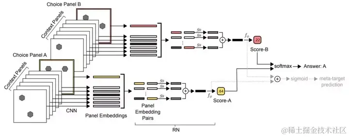 CNN会独立处理每个内容panel并且一个单独的回答会选择一个panel来产生9个矢量embedding。然后将这组embedding传递给RN(其输出是单个sigmoid单元),为相关答案选择panel的“得分”进行编程。 通过该网络进行8次这样的传递(为简便起见,我们仅描绘2次),每次答案选择一次,就会通过softmax函数得分以确定模型的预测答案。