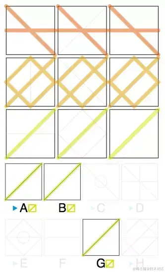 这道题中还需要观察“线”的关系,我们观察到每一排最右方的线是AND的关系,即同时出现在左边两个格的线才会出现在第三个格。