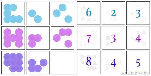 标准的人类IQ测试通常要求测试者运用他们从日常经验中学到的原理来解释感知上简单的视觉场景。例如,人类测试者可能已经通过观察植物生长或建筑物的搭建,在数学课上学习加法,或跟踪利息累计的银行余额等了解了 “进展” 这个概念(即事物某些属性可能增加的概念)。然后,他们可以在IQ题中应用这个概念来推断随着序列增加,形状的数量、大小,甚至颜色的深浅等属性。