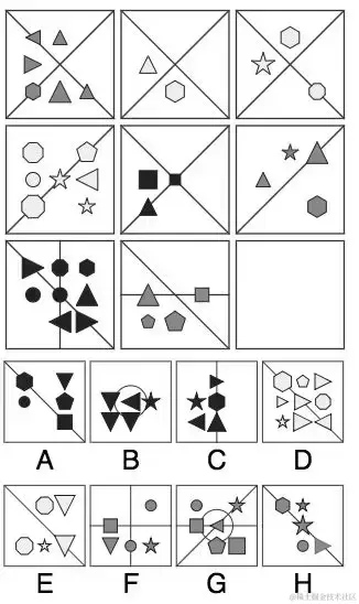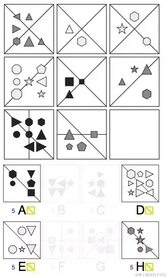 首先,每一列的三角形状的数目分别是1个、5个和7个,因此,右下角三角形状的数量应该是1,因此我们排除了B、F、G这三个答案,剩下A、C、D、E、H。