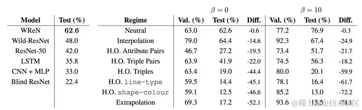 当需要使用属性值在先前看到的属性值之间 “内推” (interpolated),以及在不熟悉的组合中应用已知的抽象关系时,模型的泛化效果非常好。但是,同样的网络在 “外推” (extrapolation)机制中表现糟糕得多,在这种情况下,测试集中的属性值与训练期间的属性值不在同一范围内。对于在训练中包含深色物体,但测试中包含浅色物体的谜题中就会出现这种情况。当模型被训练来将以前见到的关系(比如形状的数量)应用到一个新的属性(比如形状的大小)时,泛化性能也会更差。