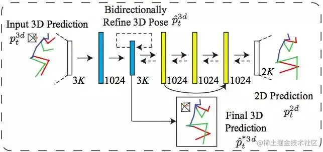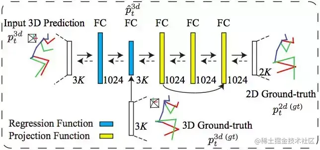 3D-to-2D 人体位姿映射模块的学习目标,就是将 3D 人体位姿的 2D 映射与预测的 2D 人体位姿两者间的差异最小化,以实现对中间 3D 人体位姿预测的双向校正 (或细化)。