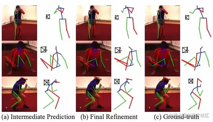 新方法在 Human3.6M 基准测试中的一些可视化结果。(a) 为 2D-to-2D 位姿变换模块估计的中间 3D 人体位姿,(b) 为 3D-to-2D 位姿映射模块细化的最终 3D 人体位姿,(c) 为 ground-truth。估计的 3D位姿被重新映射到图像中,并在侧面 (图像旁边) 显示出来。如图所示,与 (a) 相比,(b)中预测的 3D 位姿得到了显著的修正。红色和绿色分别表示人体左侧和右侧。来源:论文《自监督学习引导的人体三维位姿估计》[1]