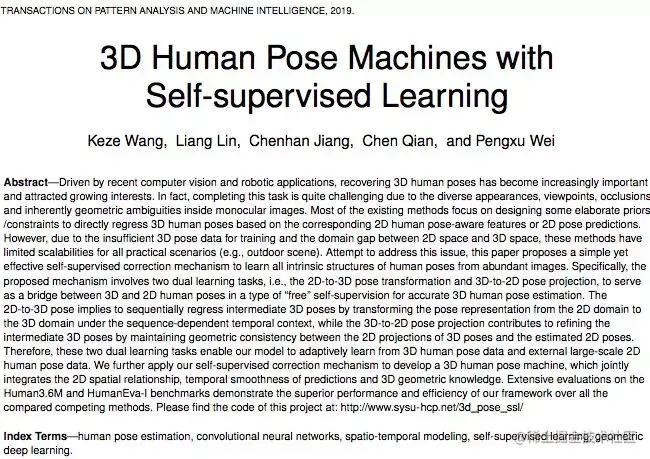 这篇论文题为《自监督学习引导的人体三维位姿估计》(3D Human Pose Machines with Self-supervised Learning),作者是王可泽,林倞,江宸瀚,钱晨和魏朋旭。
