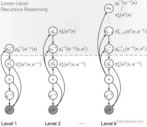 k 阶递归推理图模型。a 代表思考深度,隐式的对手建模用函数 ρ-i 逼近。0 阶模型认为对手完全随机。上图灰色区域表示智能体 i 的递归推理思考过程。想得更深一级的智能体返回得出当前轮次的最优结果。每一级计算都包含上一级的计算,比如 2 阶包含 1 阶。来源:arxiv.org/abs/1901.09…