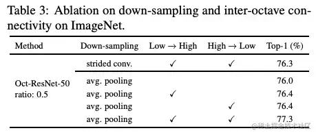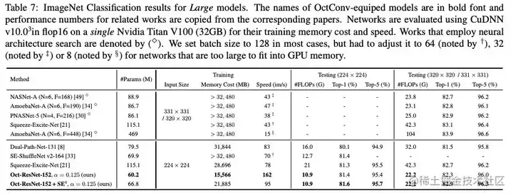 采用 OctConv 的 ResNet-152 仅用 22.2 GFLOPs 就能在 ImageNet 上实现 82.9% 的 top-1 分类精度。