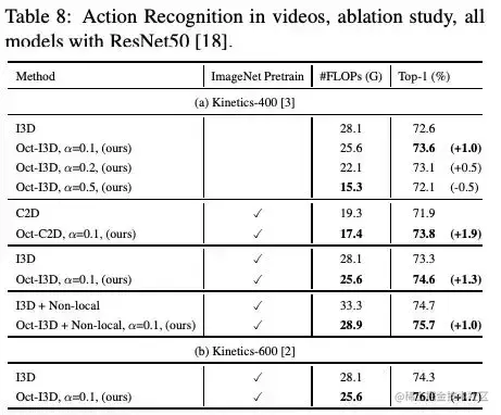 然后,我们用 Kinetics-400 和 dynamics 600 数据集,证明所提出的 OctConv 也适用于 3D CNN。
