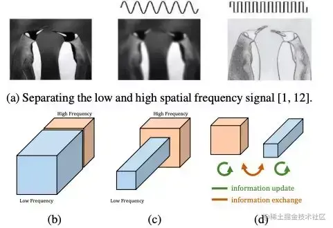图 1:(a) 动机。视觉的空间频率模型的相关研究表明,自然图像可以分解为低空间频率和高空间频率两个部分。(b) 卷积层的输出图也可以根据其空间频率进行分解和分组。(c) 所提出的多频特征表示将平滑变化的低频映射存储在低分辨率张量中,以减少空间冗余。(d) 所提出的 Octave Convolution 直接作用于这个表示。它会更新每个组的信息,并进一步支持组之间的信息交换。