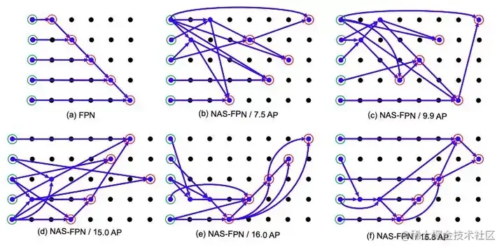 图 7 中,每个点代表一个特征层。同一行的特征层具有相同的分辨率。分辨率在自底向上下降。箭头表示内部层之间的连接。图中左侧是输入层。金字塔网络的输入用绿色圆圈标记,输出用红色圆圈标记。(a) 基线 FPN 架构。(b-f) 通过对 RNN 控制器的训练进行神经结构搜索发现的 7-cell NAS-FPN 结构。(f) 我们在实验中使用的 NAS-FPN。