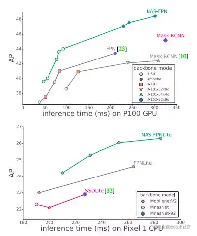 图 1:移动设备上精确模型 (上) 和快速模型 (下) 的平均精度 vs 每张图像的推理时间。绿色曲线突出了 NAS-FPN 与 RetinaNet 组合的结果。