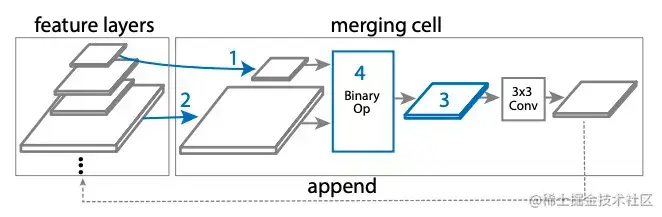 我们提议 merging cell,这是 FPN 的一个基本构建块,将任意两个输入特性层合并到一个输出特性层中。