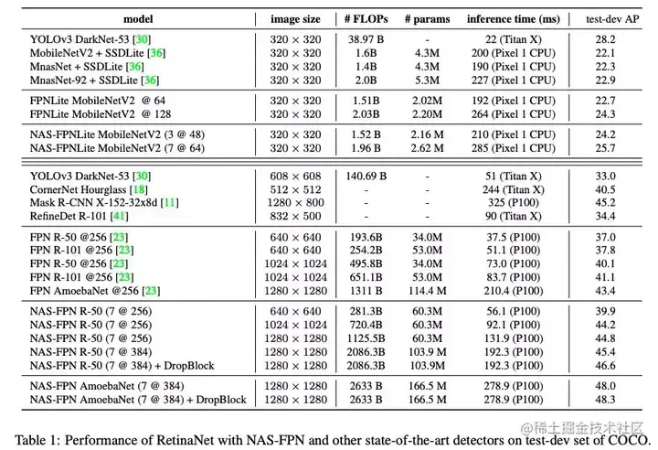 表 1:使用 NAS-FPN 和其他最先进的检测器的 RetinaNet 在 COCO 的 test-dev set 上的性能比较