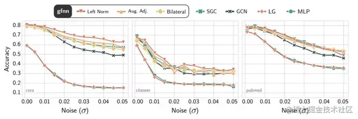 图 4:Cora (左)、Citeseer (中) 和 Pubmed (右) 数据集上的基准测试精度。噪声水平通过在特征值上增加白噪声的标准差来测量。