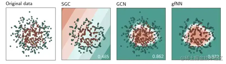 最后,我们将 gfNN 与 SGC 模型进行了比较。虽然 SGC 在基准数据集上计算速度快、精度高,但我们的分析表明,当特征输入是非线性可分的时,SGC 会失败,因为图卷积部分对非线性流形学习没有贡献。为了实证证明这个观点,我们创建了一个人工数据集。