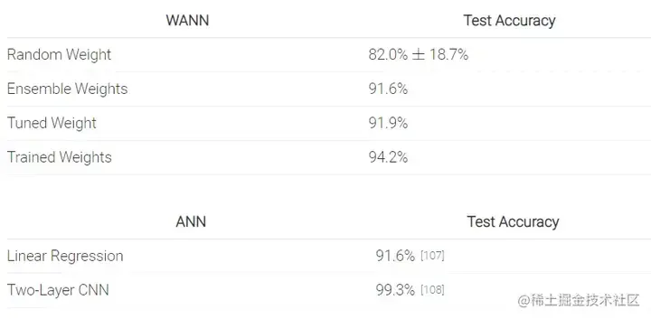 具有随机初始化的传统网络在 MNIST 上的精度约为 10%,但这种随机权重的特殊网络架构在 MNIST 上的精度 (> 80%) 明显优于随机初始化网络。在没有进行任何权重训练的情况下,当我们使用一组未经训练的权重时,精度提高到 > 90%。
