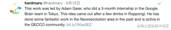 这项工作是由 Adam Gaier 所领导的,他在东京的谷歌大脑实习了 3 个月。特别有意思的是,这个研究想法是他在六本木喝了几杯酒之后产生的。