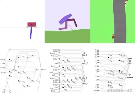 权重无关神经网络的例子:两足步行者 (左),赛车 (右)