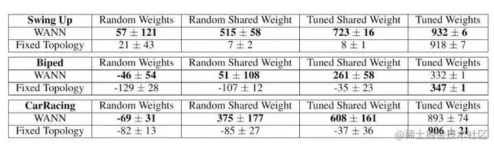结果如上表所示,作为基线的传统固定拓扑网络在经过大量调整后只产生有用行为,相比之下,WANN 甚至可以使用随机共享权重。虽然 WANN 架构编码强烈偏向解决方案,但并不完全独立于权重值,当单个权重值随机分配时,模型就会失败。WANN 通过编码输入和输出之间的关系来起作用,因此,虽然权重大小并不重要,但它们的一致性,特别是符号的一致性,是非常重要的。单个共享权重的另一个好处是,调整单个参数变得非常容易,无需使用基于梯度的方法。