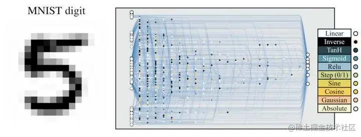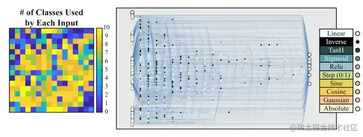 右:在 [2, 2] 范围内可能的激活函数 (线性、阶跃、正弦、余弦、高斯、tanh、sigmoid、inverse、绝对值、ReLU)。