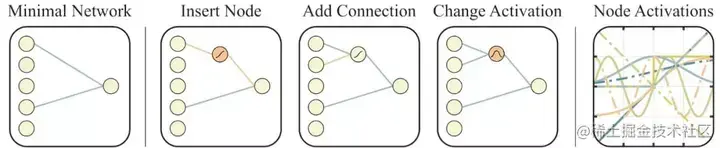 用于神经网络拓扑搜索的运算符 (operators) 受到神经进化算法 NEAT 的启发。在 NEAT 中,拓扑和权重值同时优化,这里我们忽略了权重值,只应用拓扑搜索运算符。
