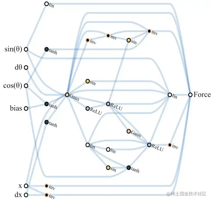 第 1024 代最佳性能的 CartPoleSwingUp 任务 WANN 网络示意图