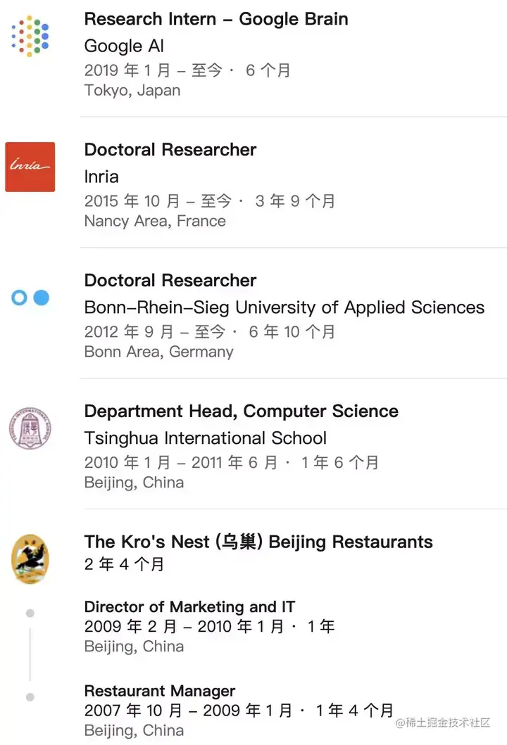 而在 2005 年本科毕业到 2011 年再次回到学校的期间,有两年半的时间 Adam Gaier 在北京乌巢餐厅担任餐厅经理、市场及 IT 总监;然后在清华大学国际学校,计算机科学系系主任。2019 年 1 月至今他在谷歌大脑东京部门担任实习研究员。