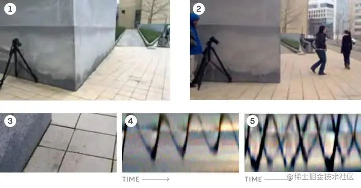 通过在角落(1)附近拍摄阴影半影,可以获得有关角落周围物体的信息(2)。当隐藏图像区域中的物体移动时,它们向半影投射的光线相对于墙壁扫过不同的角度。这些细微的强度和颜色变化通常是肉眼看不到的(3),但可以通过算法来增强。图示为从半影的不同角度投射的光的原始视频显示一个人在移动(4)以及两个人在角落处移动(5)。