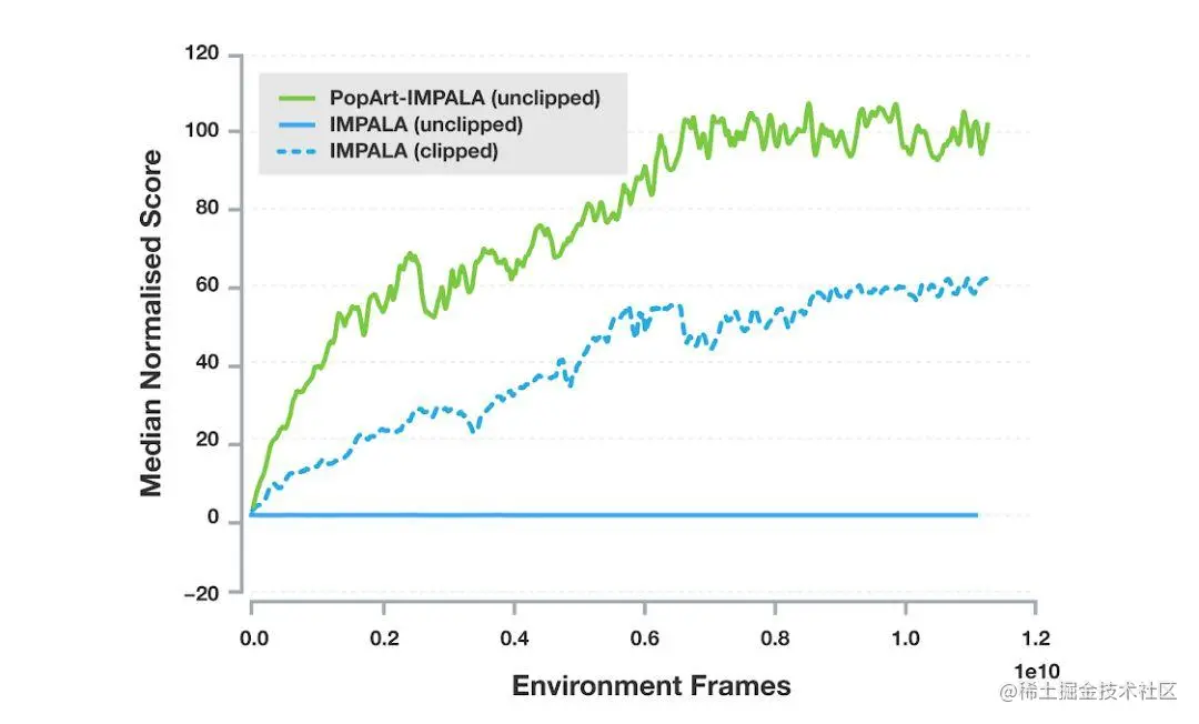 这远远高于使用reward clipping的baseline,而没有使用reward clipping的baseline根本无法达到有意义的表现,因为它无法有效地处理不同游戏之间的奖励尺度的巨大变化。
