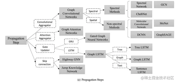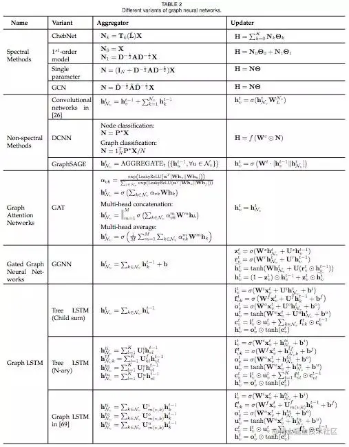 GNN 的各种变体,通过比对各自的 aggregator & updater,就能轻松分辨不同的 GNN 模型。这只是这篇综述强大图表的一个示例。