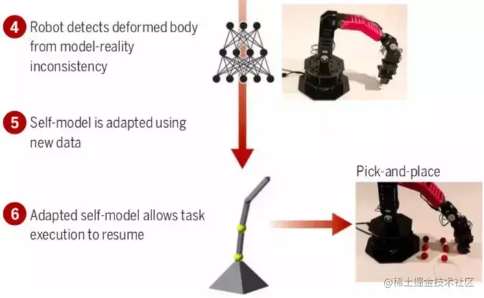 研究人员利用3D打印打造了一个变形的部件(下图红色部件)来模拟机体损伤,结果机器人能够检测到这一变化,并重新训练自我模型。新模型能够以很少的性能损失为代价,重新成功执行拾取和放置任务。