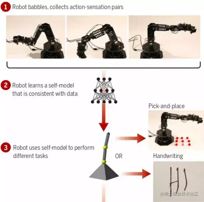 考虑到这台机器人本身(从设计上)是可以用来完成多项任务的,研究人员便想,何不从中抽象出一个的“自我模型”(self-model),然后以此为基础,让机器人学习各种新的任务,在此过程中不断调整原有的自我模型。这样一来,不就能够实现持续的自监督学习了吗?