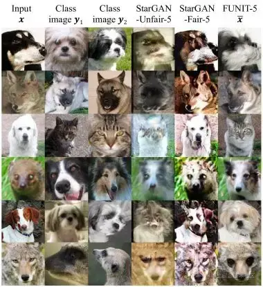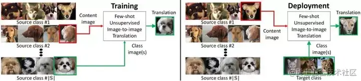 需要注意的是,FUNIT 生成器有两个输入:1) 一个内容图像;2) 一组目标类图像。它的目的是生成与目标类图像相似的输入图像的转换。