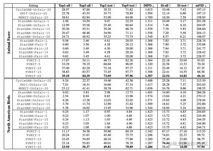 如表 1 所示,FUNIT 框架在 Animal Faces 和 North American Birds 两个数据集的所有性能指标都优于用于小样本无监督图像到图像转换任务的基线模型。