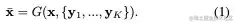 与现有无监督 image-to-image translation 框架中有条件的图像生成器不同,它们是将一张图像作为输入,而我们的生成器 G 需要同时将一张内容图像 x 和一组 K 类图像 {y1, ..., yK} 作为输入,生成输出图像 x¯,公式如下: