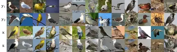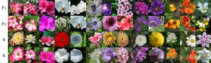 从上到下分别是来自动物面孔、鸟、花和食物数据集的结果。每个示例随机展示了 2 张目标类中的图像,输入内容图像 x,以及转换后的输出图像 x¯。