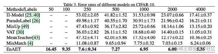 在CIFAR10上,EnAET首次对仅有100张有标注图片的情况进行实验,取得了9.35%的错误率,同时在250张有标注图片分类任务下,相比于以前的SOTA,成功将错误率从11.08%下降到7.6%。具体对比如下: