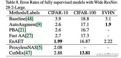 基于模型1,与所有基于该模型的全监督方法进行了对比,其中包括基于数据增强策略搜索的AutoAugment的方法,EnAET模型均取得显著提升,具体对比如图8所示。