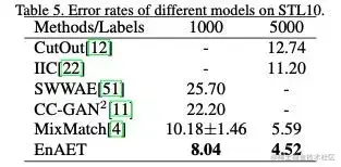 在STL10任务下,EnAET在1000标注样本下将错误率从10.18%下降到8.04%,在使用所有标注样本情况下将错误率从5.59%降到4.52%。