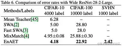 在CIFAR-100上,EnAET首次实验了每类仅有十张图片的情况,取得了58.73的错误率。在经典的10000张有标注图片分类任务下,成功将错误率从38.65%降到了26.93%。具体对比如下: