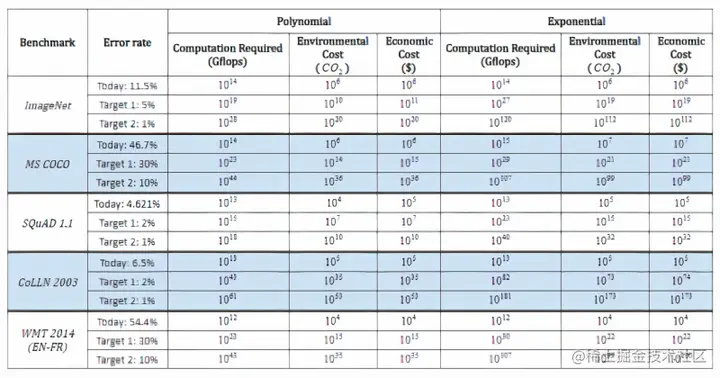 研究人员分析了预印本服务器Arxiv.org上的1058篇论文和其他基准资料,以理解深度学习性能和计算之间的联系,特别关注图像分类、目标检测、问题回答、命名实体识别和机器翻译等领域。他们分别对计算需求进行了两项分析,反映了可用的两类信息:1、每一网络遍历的计算量,或给定深度学习模型中单次遍历(即权值调整)所需的浮点运算数。2、硬件负担,或用于训练模型的硬件的计算能力,以处理器数量乘以计算速度和时间计算。(研究人员承认,虽然这是一种不精确的计算方法,但在他们分析的论文中,它的报道比其他基准要广泛得多。)报告说,除从英语到德语的机器翻译(使用的计算能力几乎没有变化)外,所有基准均具有「统计学上显着性」的斜率和「强大的解释能力」。对象检测,命名实体识别和机器翻译对于硬件的负担大幅增加,而结果的改善却相对较小,计算能力解释了流行的开源ImageNet基准测试中图像分类精度差异的43%。研究人员估计,三年的算法改进相当于计算能力提高了10倍。他们写道:「总体而言,我们的结果清楚地表明,在深度学习的许多领域中,训练模型的进步取决于所使用的计算能力的大幅提高。」「另一种可能性是,要改善算法本身可能需要互补地提高计算能力。」在研究过程中,研究人员还对预测进行了推断,以了解达到各种理论基准所需的计算能力以及相关的经济和环境成本。即使是最乐观的计算,要降低ImageNet上的图像分类错误率,也需要进行100000次以上的计算。