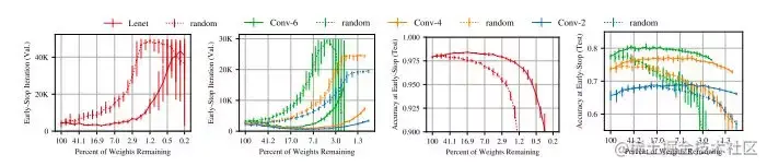 图 1:早期停止发生的迭代 (左边) 和用于 MNIST 的 Lenet 架构以及用于 CIFAR10 的 conv2、conv4 和 conv6 架构的迭代 (右边) 的测试精度。虚线是随机抽样的稀疏网络。实线是中奖彩票。