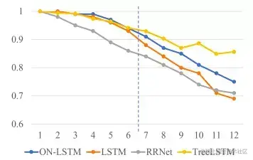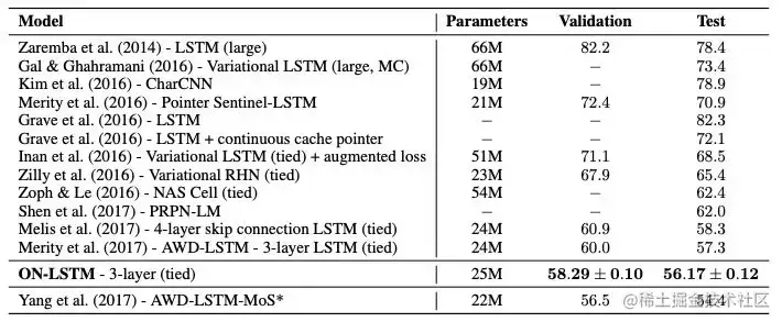 如表 1 所示,ON-LSTM 模型在共享相同的层数、嵌入维数和隐藏状态单元的情况下,比标准的 LSTM 性能更好。值得注意的是,我们可以在不添加 skip connection 或显著增加参数数量的情况下提高 LSTM 模型的性能。