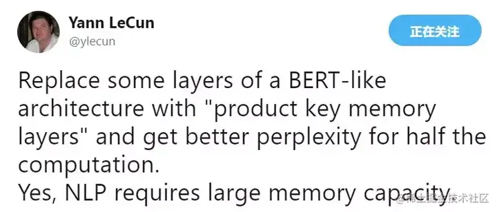 图灵奖得主,AI 大神 Yann LeCun 发 Twitter 推荐。LeCun 认为,本文用 product key memory 层替代了 BERT 模型中的结构层,实现了与后者相当的性能,计算量降低了一半。