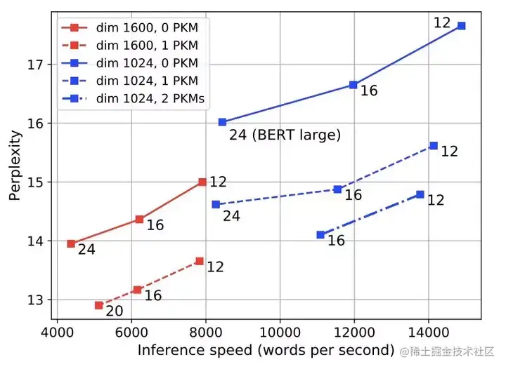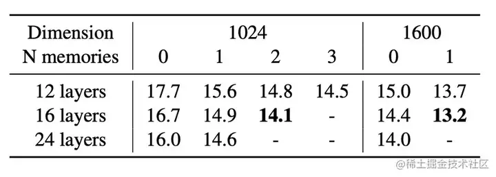 添加 2 或 3 个存储层进一步提高了性能。特别是,当内部隐藏状态具有 1600 维时,具有 12 层和存储器的模型比具有 24 层(与 BERT large 的配置相同)的模型获得更好的困惑,速度几乎快了两倍。将内存添加到内部维度等于 1600 的 large 型模型时,推理时间几乎不会增加。
