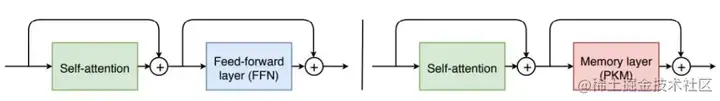 图 3:左:典型的 transformer 模块由自注意力层和 FFN 层(双层网络)组成。右图:在我们的系统用 product 存储器层替换了 FFN 层,这类似于具有非常大的隐藏状态的稀疏 FFN 层。在实践中,我们仅替换 N 层 FFN 层,其中 N∈{0,1,2}