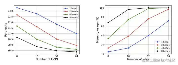研究人员还注意到。具有相同 h×k(h 是 head 数,k 是最近邻数)的模型具有相似的内存使用。比如,(h, k) ∈ {(1, 64),(2, 32),(4, 16),(8, 8)} 所有内存使用率约为 70%,困惑度约为 20.5。