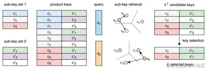 图 2:product key 示意图。我们定义了两个离散的密钥子集(子密钥集 1 和子密钥集 2)。它们会产生更大的密钥集,这些密钥永远不会明文表示。对于给定的查询,我们将其分为两个子查询(q1 和 q2)。在每个子集中选择 k 个最接近的密钥(图中的 k = 2),从而隐含地选择 k×k 个密钥。保证使用查询最大化内积的 k 个 key 属于该子集,在该子集上可以更高效地进行搜索。